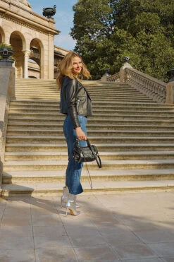 Black Leather Collarless Biker Jacket