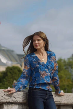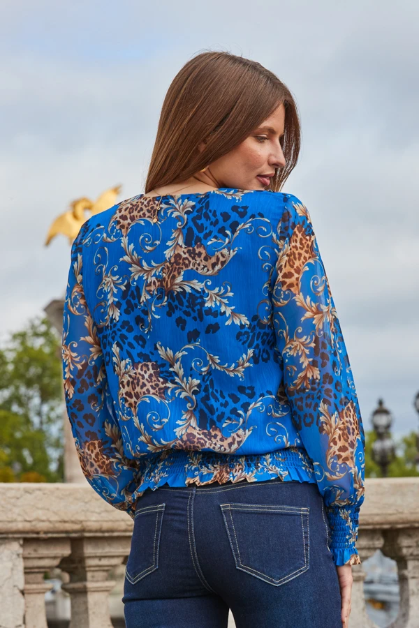 - Semi-sheer blouson sleeves create a gorgeous silhouette